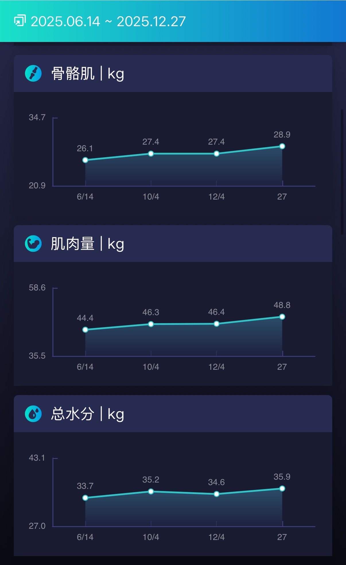 因为主要的目标就是把体脂降下来,所以除了坚持控制饮食之外,今年我也增加了有氧的运动量。也因此爱上了跑步。从 6 月份的一个月 20,30 km,到 8 月份的近 80 km,后续每个月都在 60-80km 之间。2025 年一共跑了 399.34km。